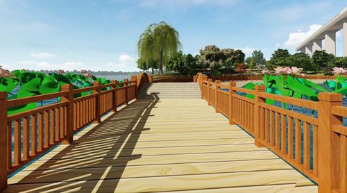 依托現狀地形地貌,打造親水平臺,結合用地規劃打造條狀小游園。